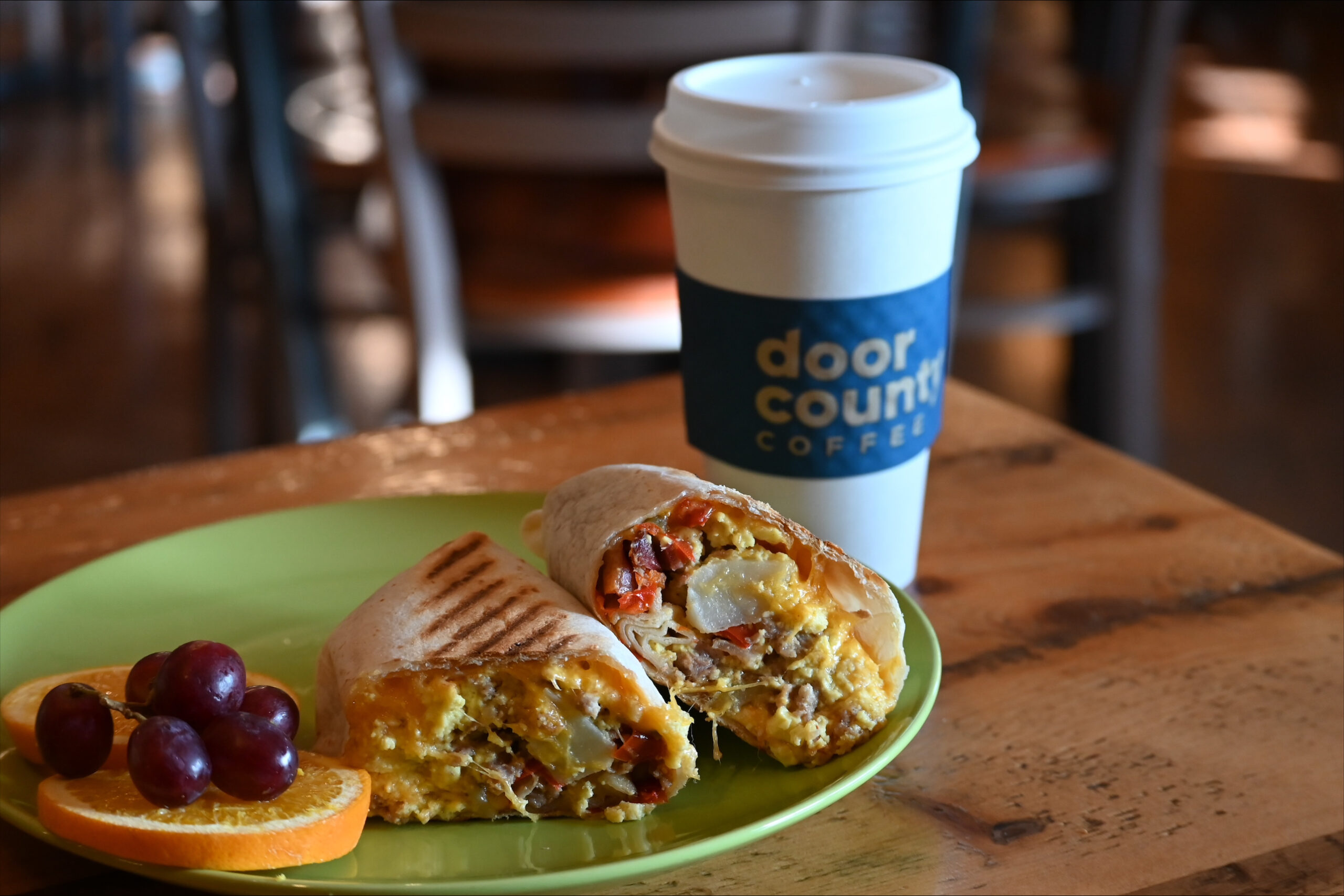 We invite you to visit us at Door County Coffee Cafe’ and Espresso Bar for a delicious breakfast and lunch experience! Our famous breakfast specials are our Hashbrown Bake and the “Kitchen Sink” and so much more! For lunch we offer housemade soups daily, which are perfect on their own or even better when paired with the Ultimate Grilled Cheese or our ever popular Chicken Salad Croissant! Bountiful salads like our Cherry Salad or Salmon Salad are all served in our warm and casual cafe!
