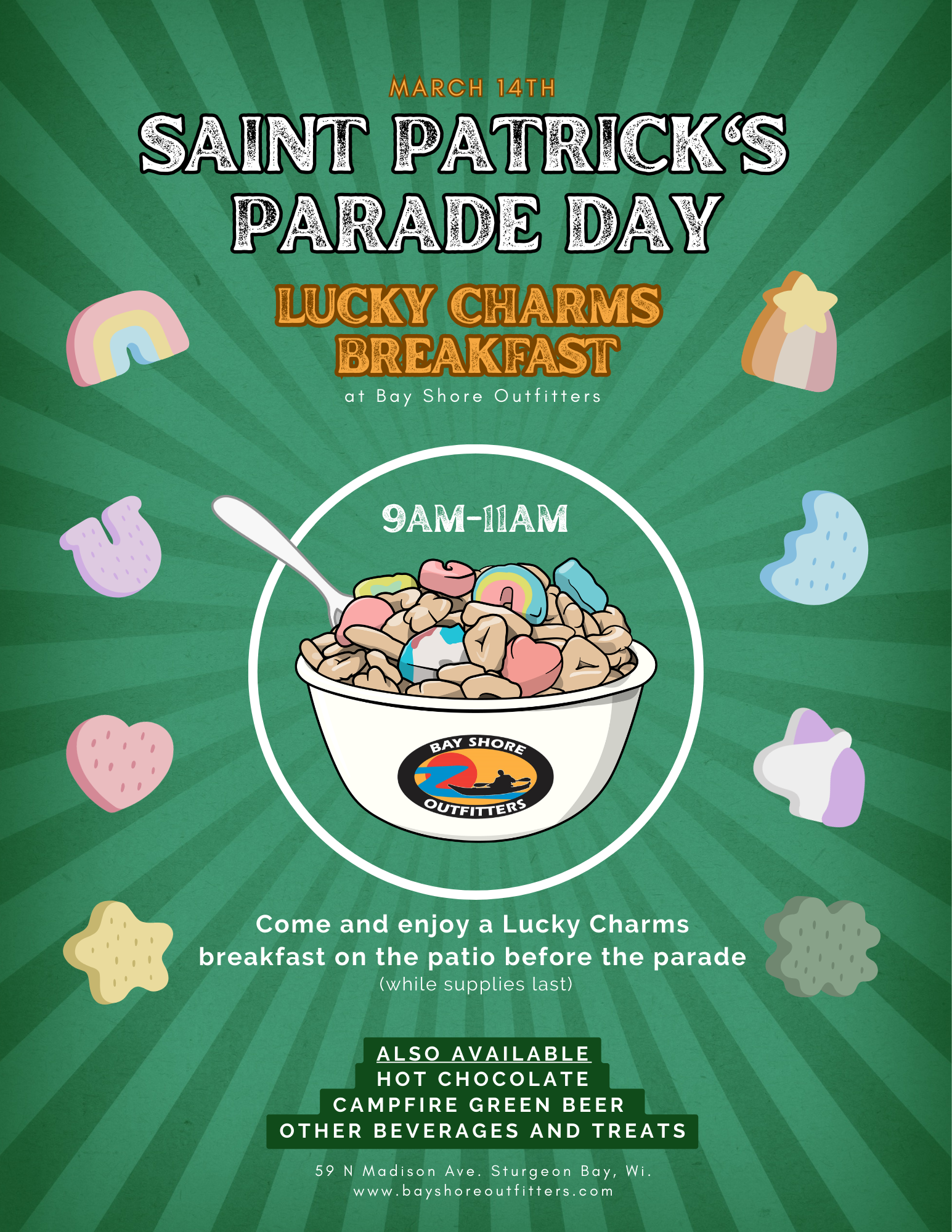 A Lucky Charms Breakfast on the patio of Bay Shore Outfitters before the St. Patrick's Day Parade. We have the cereal and milk, you bring your appetite. Along with breakfast, hot chocolate, green beer and other beverages and treats will be available at our patio pub. After breakfast stay at the best viewing spot for Sturgeon Bay's annual Parade. Come help us celebrate your new holiday tradition!