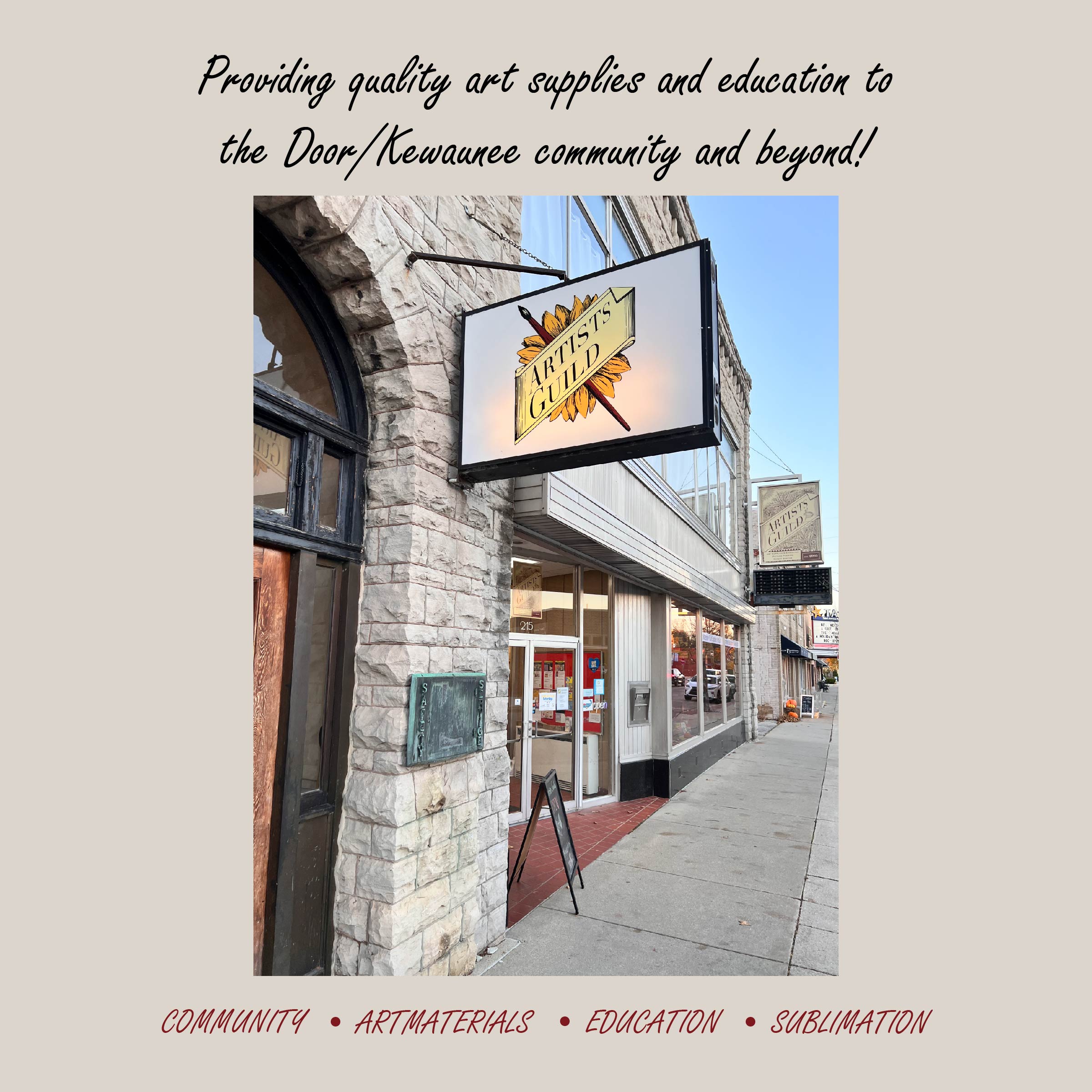 Looking for art supplies? We’re your place! Artists Guild is a locally-owned art supply store providing quality service, education, and art materials to Door/Kewaunee County and beyond! Paints, brushes, pencils, pens, drafting tools, and many more fine art and craft supplies are available for the artist and non-artist alike.
