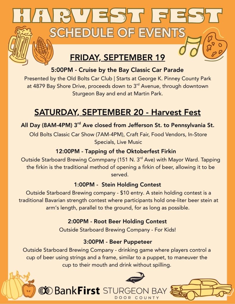 Join Destination Sturgeon Bay in welcoming the season of autumn with Sturgeon Bay’s Annual Harvest Fest on Saturday, September 20, sponsored by Bank First.