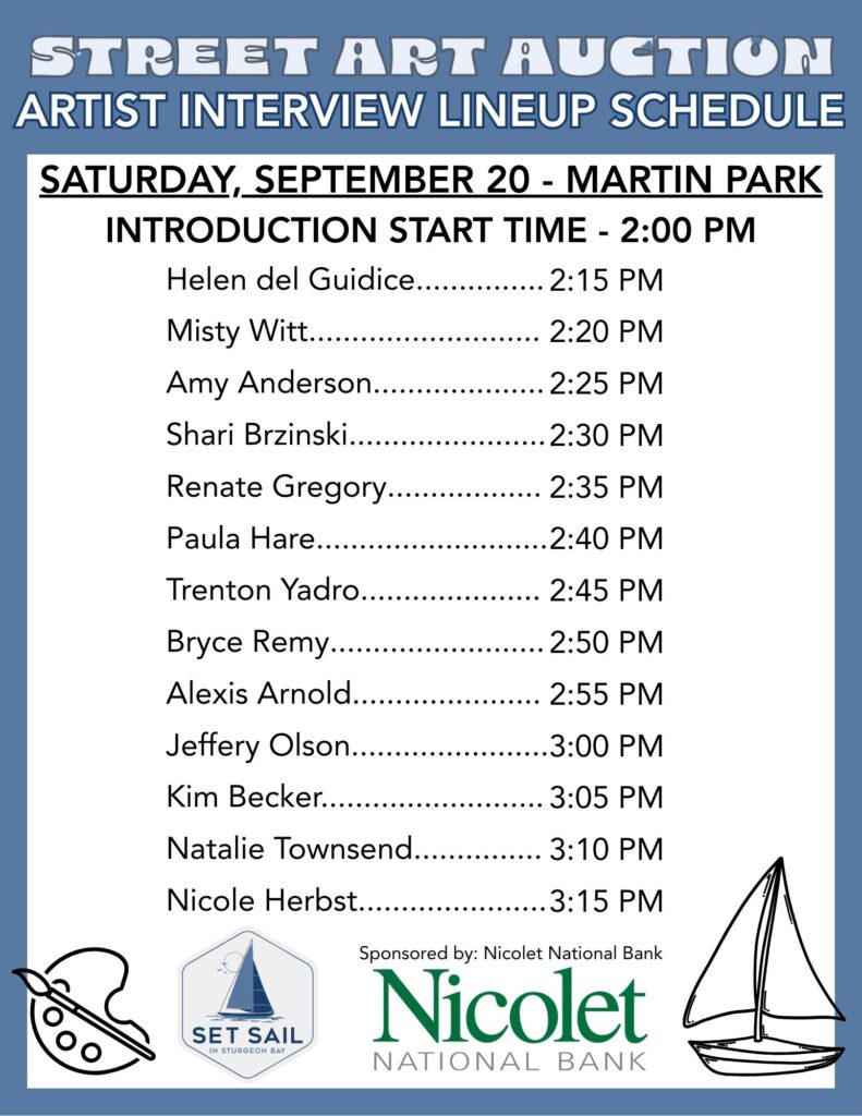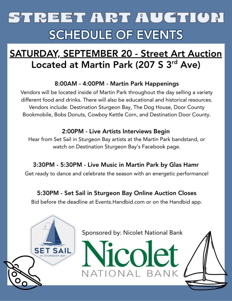 Local Happenings – Harvest FestAs the evening approaches, head down to Martin Park on South 3rd Avenue to get one last look at this year’s beautiful street art projects. Starting at 2:00 pm, hear from this year’s Set Sail in Sturgeon Bay artists as they participate in live interviews from the Martin Park bandstand. The artists will share more about their piece and the inspiration behind their work. Can’t attend? Watch the live artist interviews on the Destination Sturgeon Bay Facebook page. As a reminder, the Set Sail in Sturgeon Bay Street Art Online Auction sponsored by Nicolet National Bank will close promptly at 5:30 pm on Saturday, September 20. Bid online now and up until the close of the online auction at Events.Handbid.com or download the Handbid app.